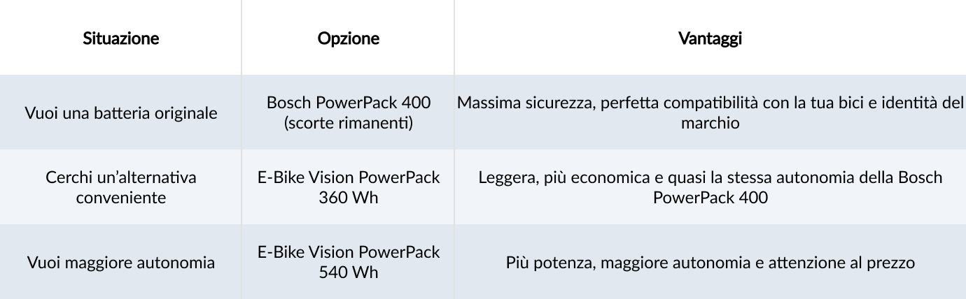 Ora che Bosch ha smesso di produrre la PowerPack 400, la batteria originale sta diventando sempre piรน difficile da reperire. Le scorte residue sono limitate e il prezzo รจ elevato. Per chi vuole assolutamente mantenere lโoriginale, si tratta quindi di una soluzione costosa e temporanea.
