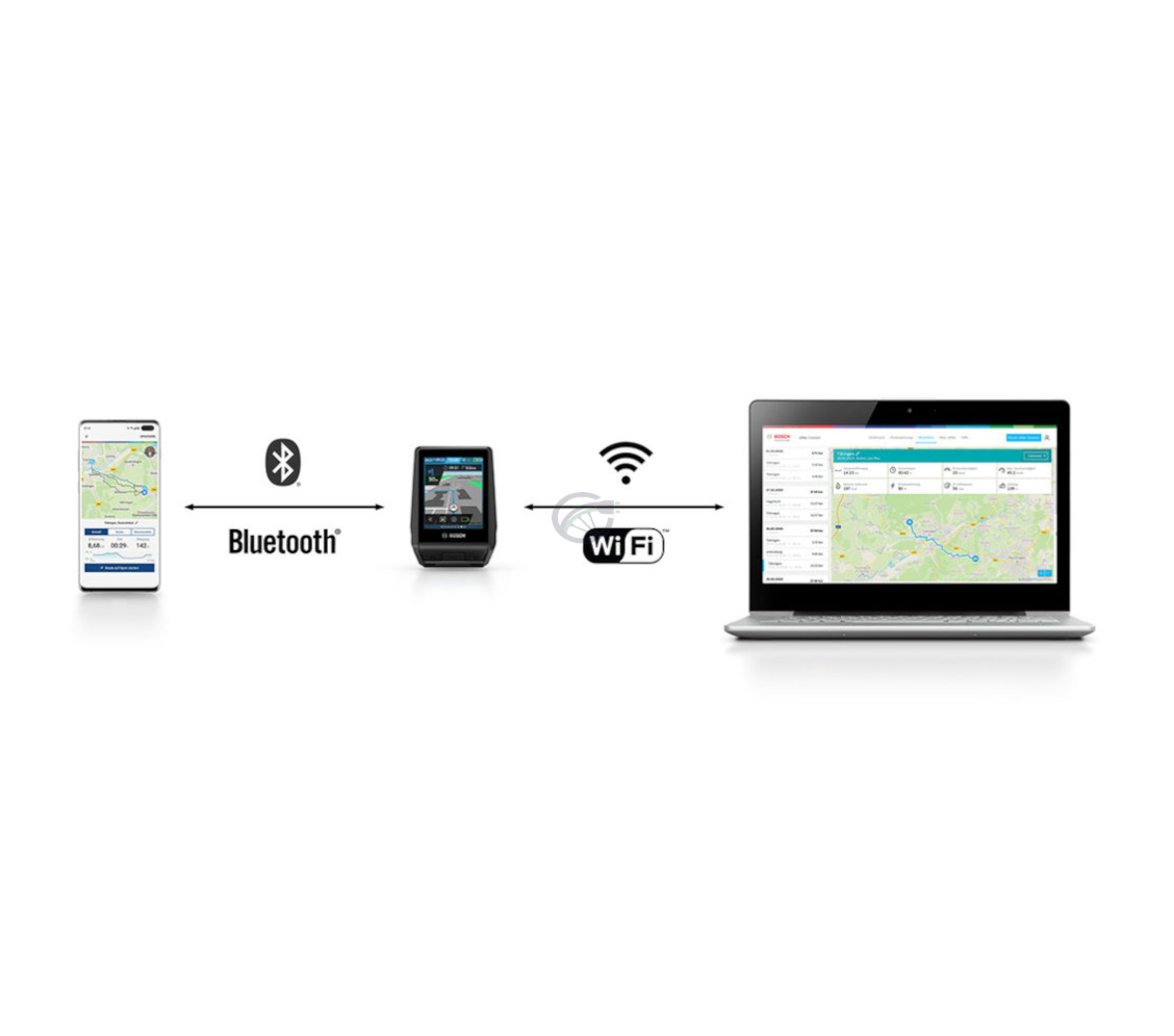 Tramite Bluetooth puoi collegare facilmente il Bosch Nyon al tuo smartphone e all’app eBike Connect. In questo modo ottieni accesso a navigazione, dati di viaggio e informazioni fitness. Il Nyon dispone di navigazione turn-by-turn con mappe topografiche e offre informazioni su potenza, consumo calorico e cadenza di pedalata. È inoltre possibile collegare un cardiofrequenzimetro per dati di allenamento più precisi.